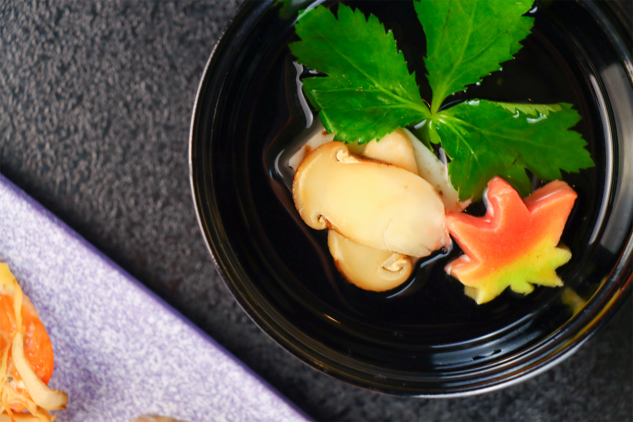 吸物 カニつみれ むすび湯葉・麩・三つ葉・五色あられ
